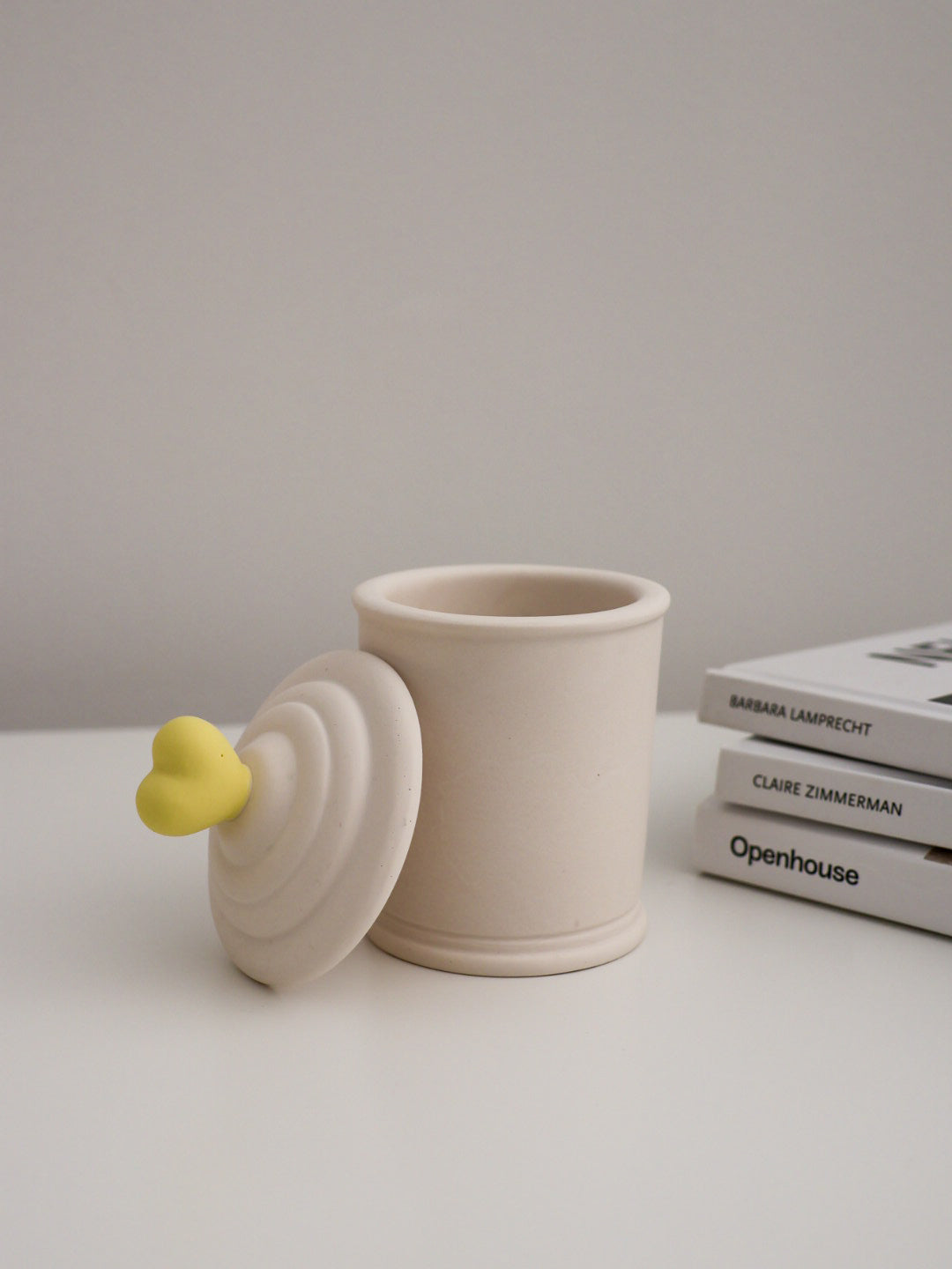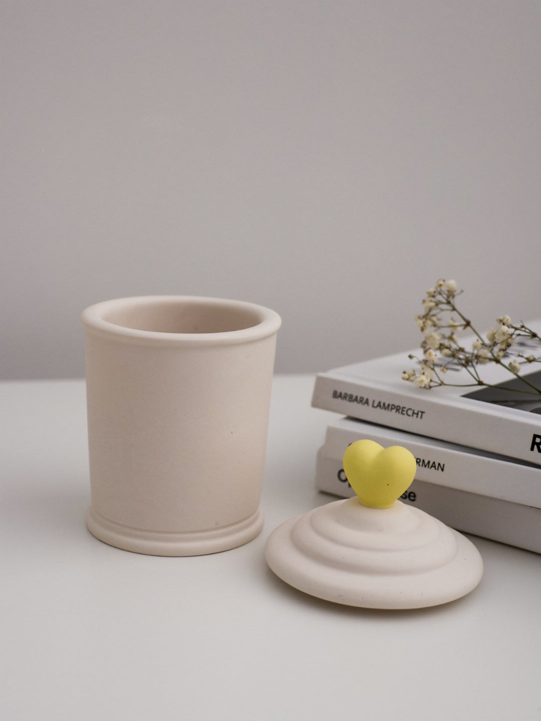 Este porta accesorios de tamaño mediano es ideal para guardar tus joyas, bijou, sahumerios, lápices o pequeños objetos. Su diseño con tapa mantiene todo protegido y ordenado, y el detalle del corazón en la parte superior suma un toque delicado y romántico a cualquier espacio.
