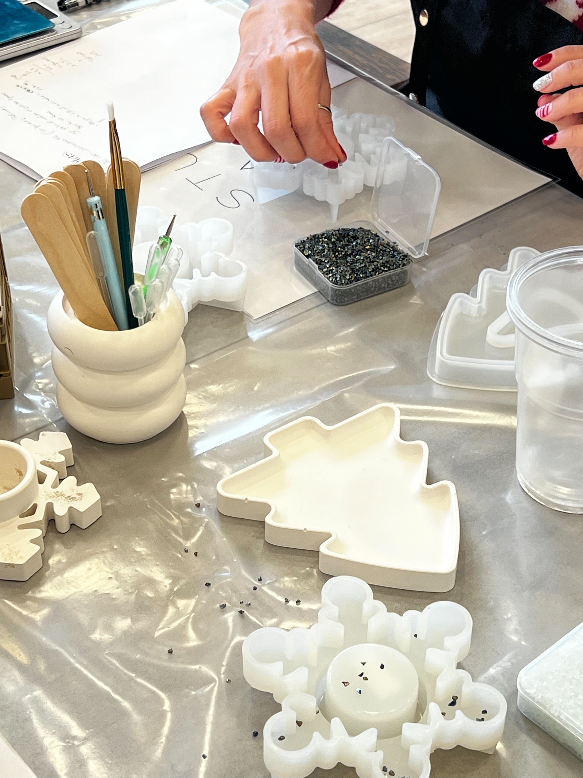 Experimentarás y podrás elegir entre diferentes toppings (pigmentos, piedras, papel oro, glitter, etc) y decorar tus piezas como mas te guste.